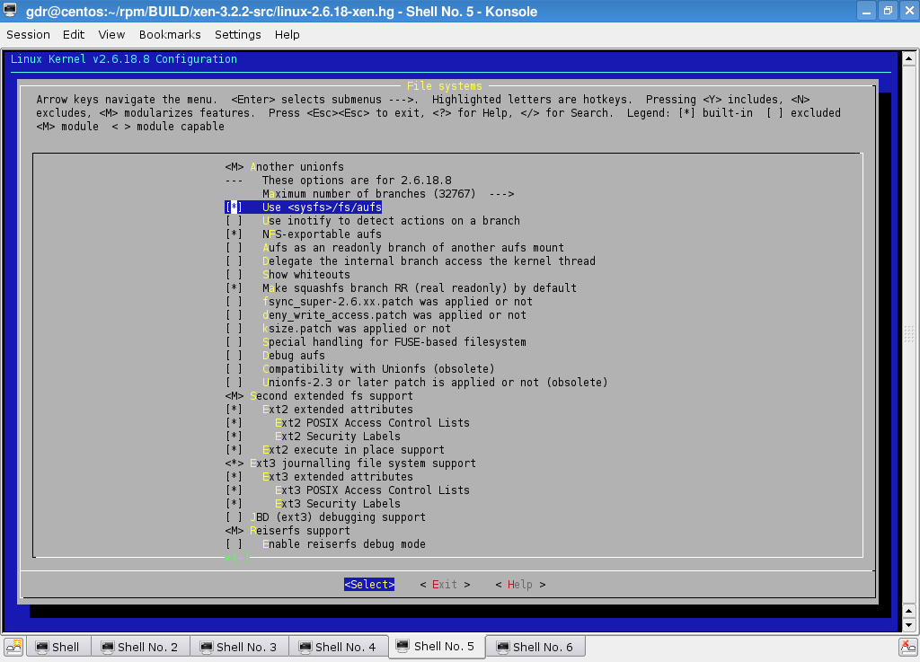In order to use AUFS, you need to build a kernel module. This process is rather described on their website and rather straightforward (unless you need to use some heavily modified kernel image, which was my case). Options regarding AUFS appear under file systems in make menuconfig. Be sure to tune maximum number of branches and check "NFS-exportable AUFS".