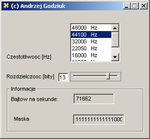 - Program demonstracyjny do pokazywania wpływu parametrów nagrywania (częstotliwość próbkowania, roździelczość) na jakość dźwięku Windows+DirectX8, 90 kB (SCREENSHOT)