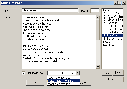 - lyricgen - windows, 30 kb - program służący do "sklejenia" kilku tekstów piosenek w jeden plik html, używam go do generowania plików z tekstami dla całych albumów muzycznych z tekstów pojedyńczych piosenek znalezionych z trudem w różnych miejscach w internecie. (screenshot)