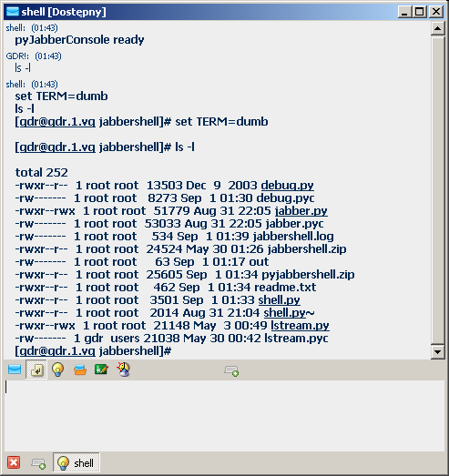 - pyJabberShell - Unix - shell unixowy z dostepem przez jabbera (screenshot), wersja bardziej proof-of-concept niż nadająca się do używania